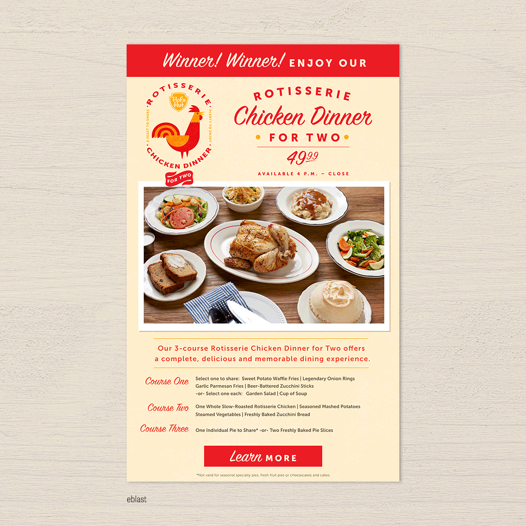 Hof’s Hut LTO “Chicken Dinner for Two,” promoted with eblasts and social media posts