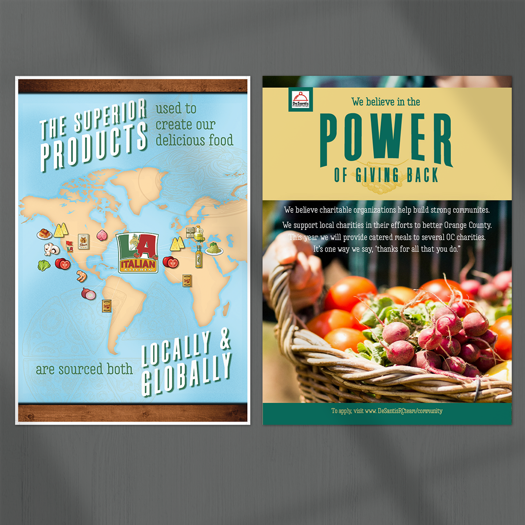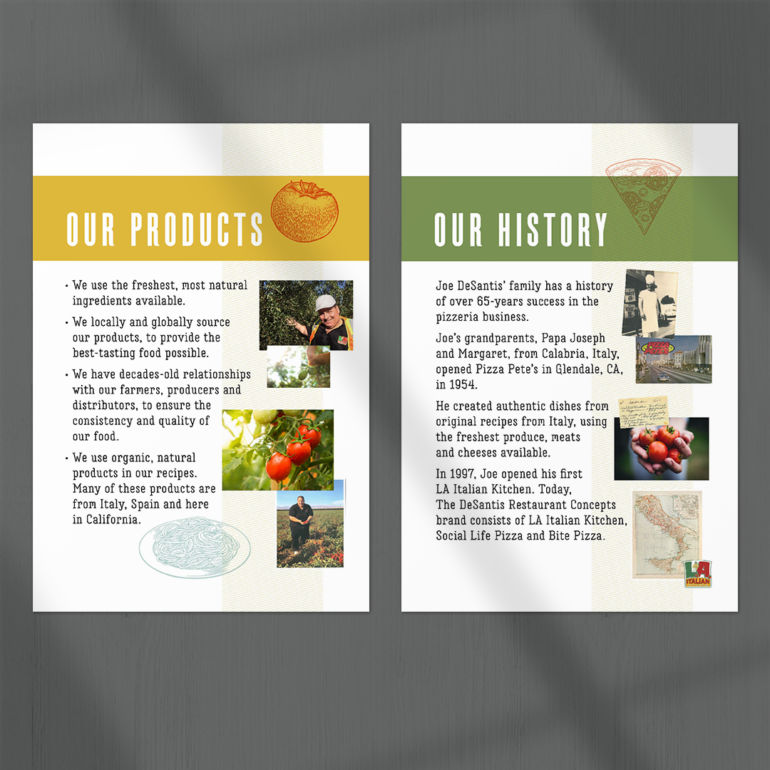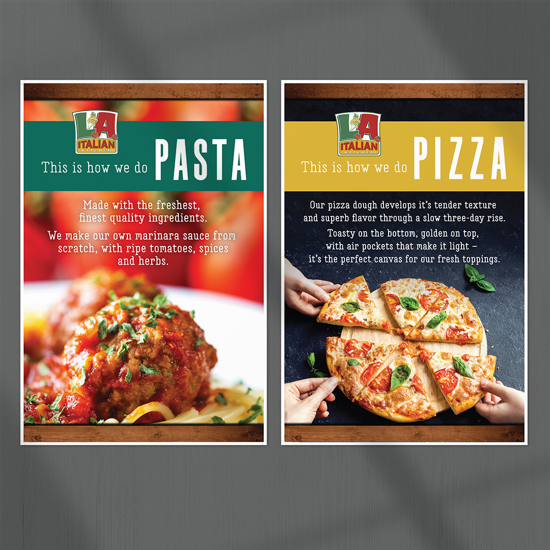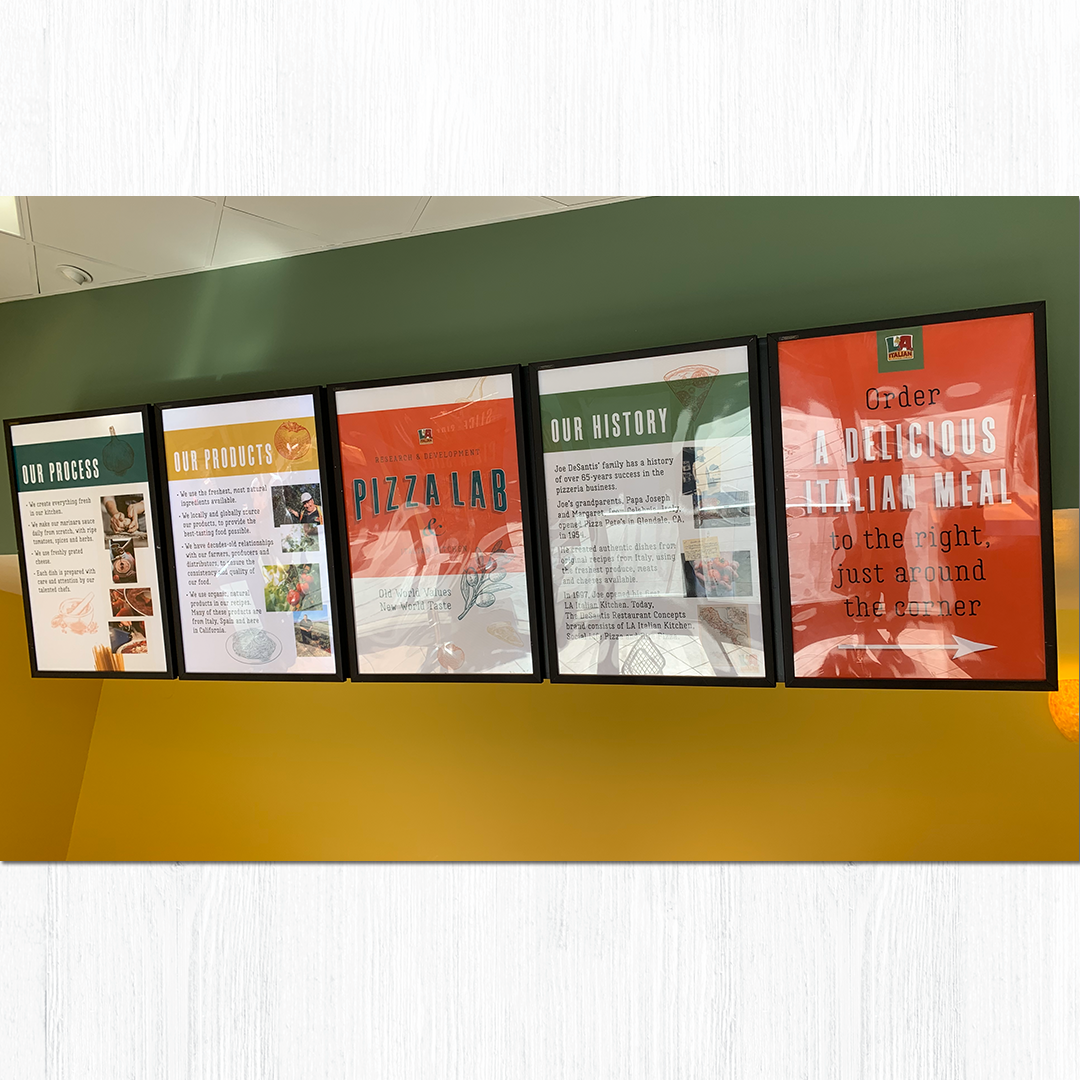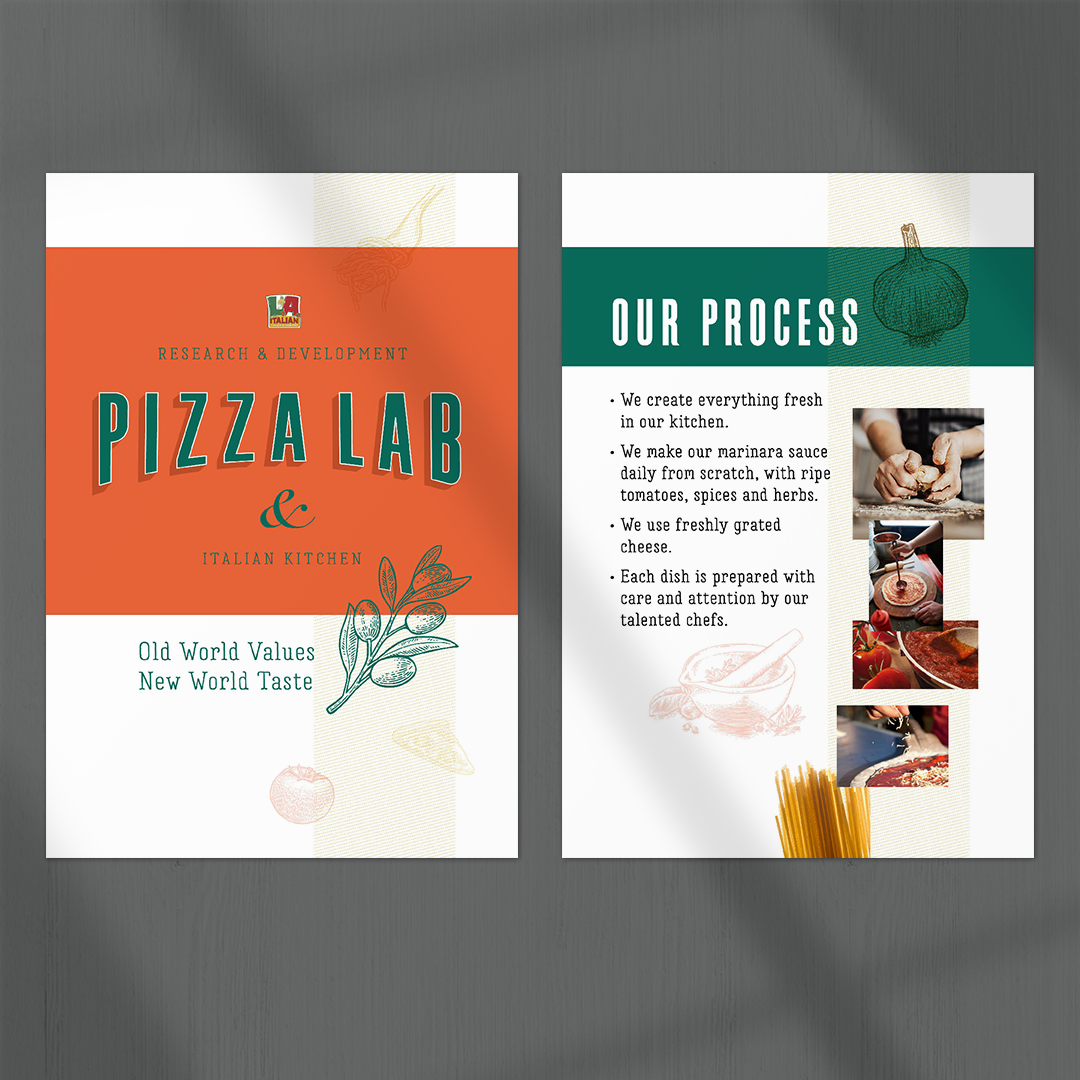 We designed a custom logotype for LA Italian Kitchen's "Pizza Development Lab" at their Orange, CA location, along with posters placed throughout the restaurant. These visuals helped establish an identity for the lab, shared its backstory, and educated guests about the process and quality behind their products. By highlighting the authenticity and freshness of the ingredients, as well as the brand's history, we enhanced the overall experience, which ultimately contributed to increased sales.