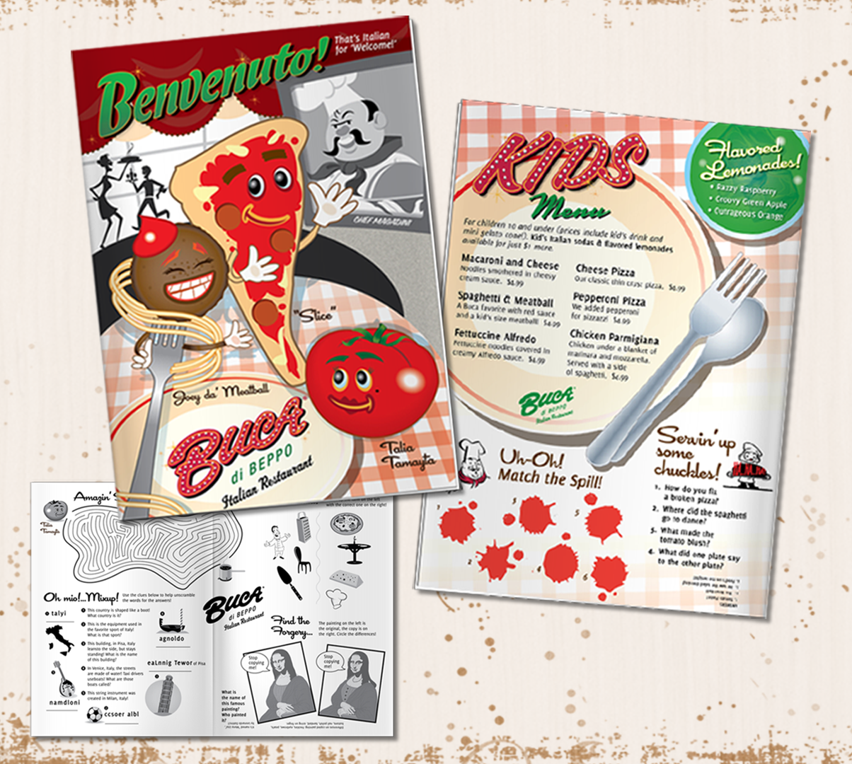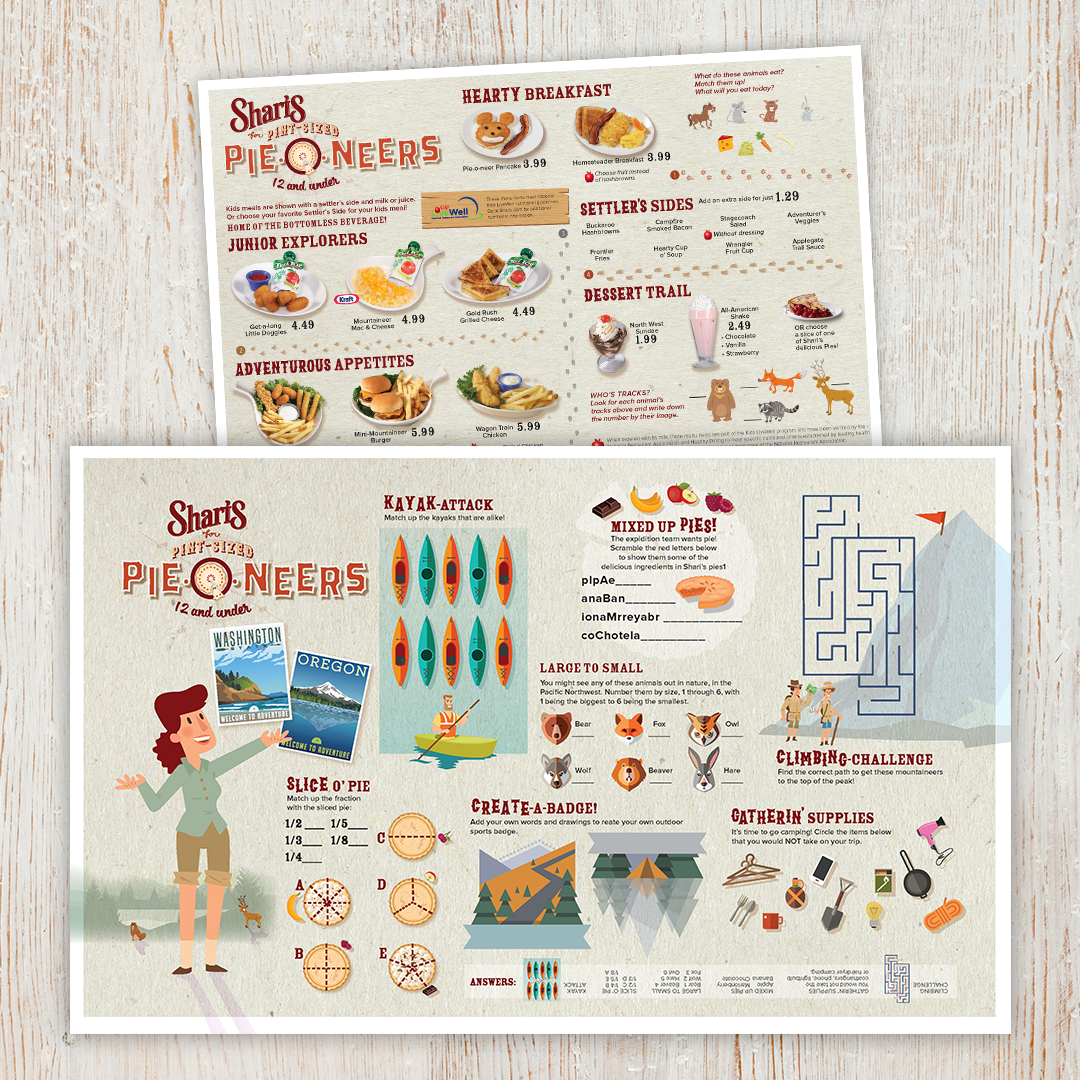 We love designing Kids Menus - especially creating unique, creative games to keep children entertained at a busy restaurant. View two menus designed for Shari’s, promoting their Pacific Northwest legacy, plus other kid’s menus for Buca di Beppo, Coco’s Restaurants and Marie Callender’s Restaurants.