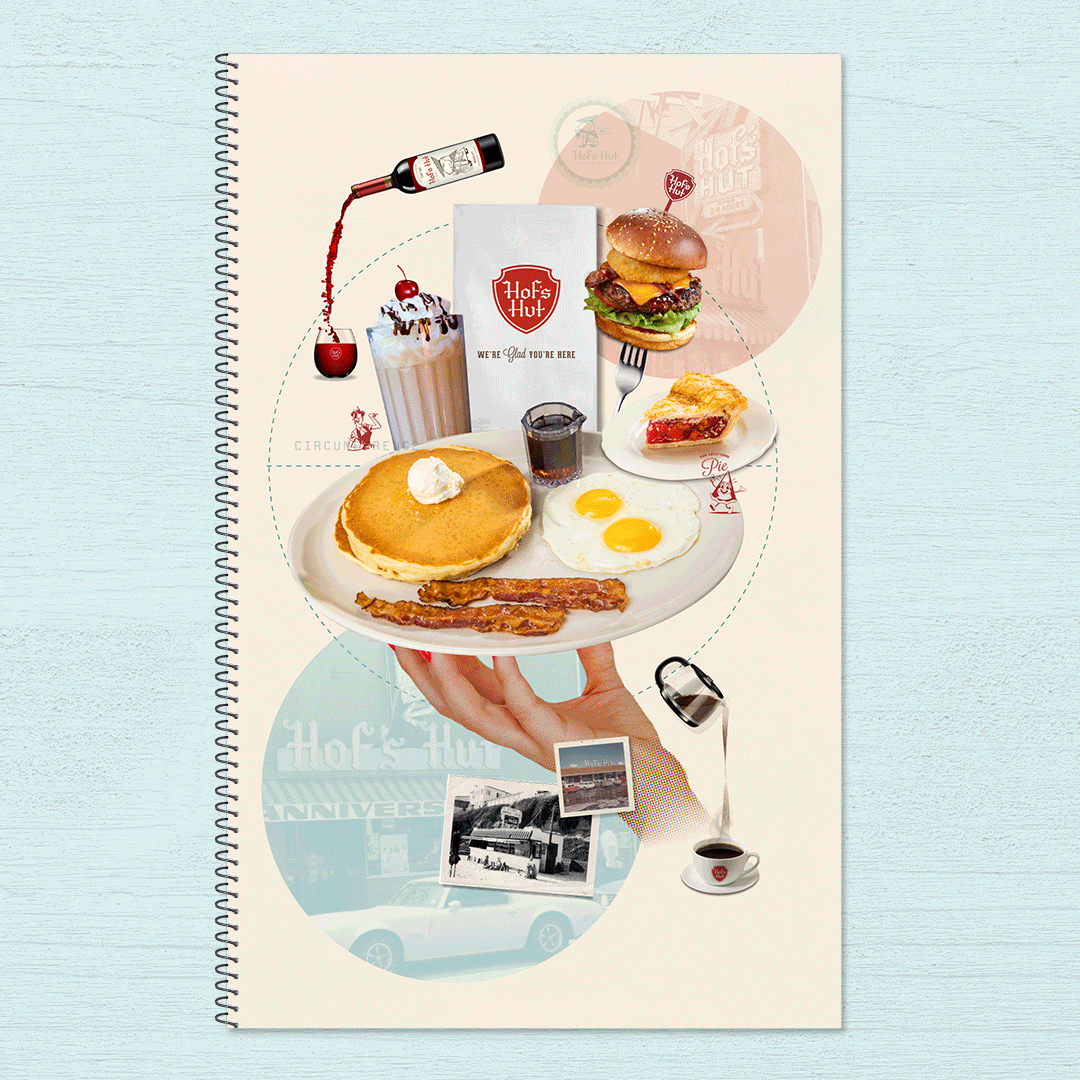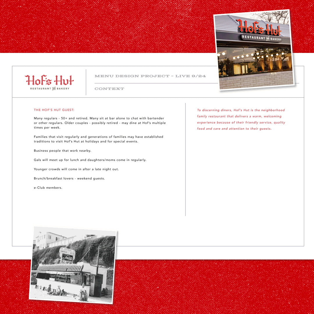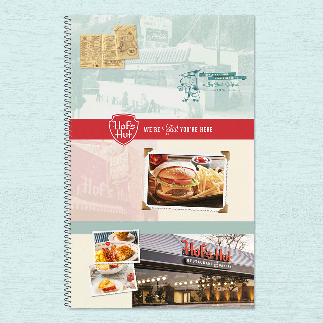 In 2022, Collins Creative undertook the redesign of Hof’s Hut’s Core Menu. Several design concepts were presented, then refined based on feedback, and a final layout was selected. This process included a design presentation, the finalized menu layout, and additional cover options provided following a revision request. Lastly, the current menu cover, as seen in the restaurants today, is also showcased.